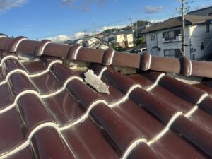 足場の下の瓦が割れています。美濃加茂市です。