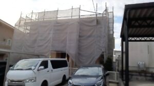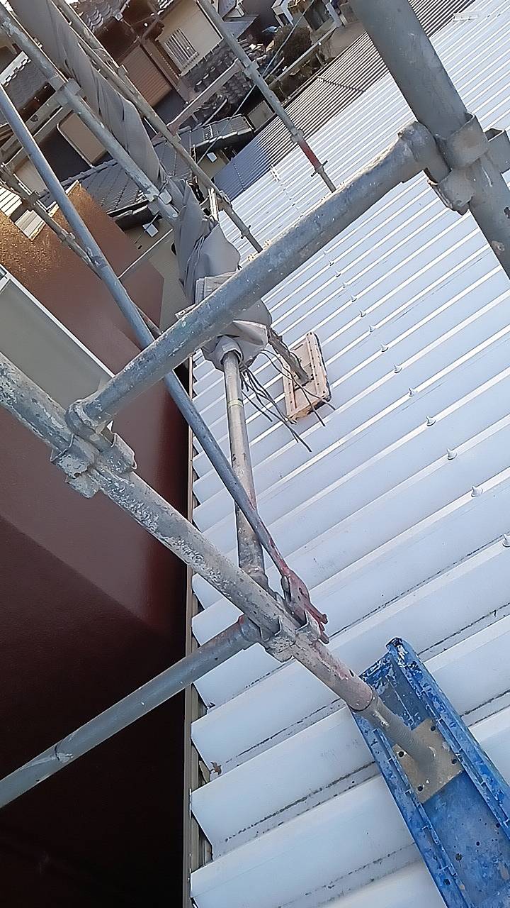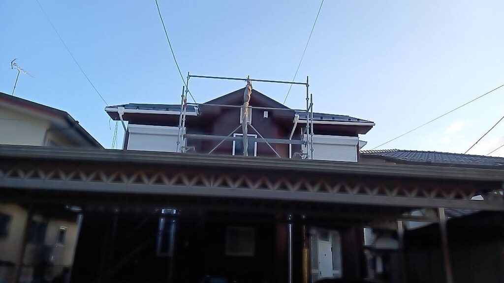 お家の前の駐車場のセッパンガレージの屋根の上に足場を組んであります。