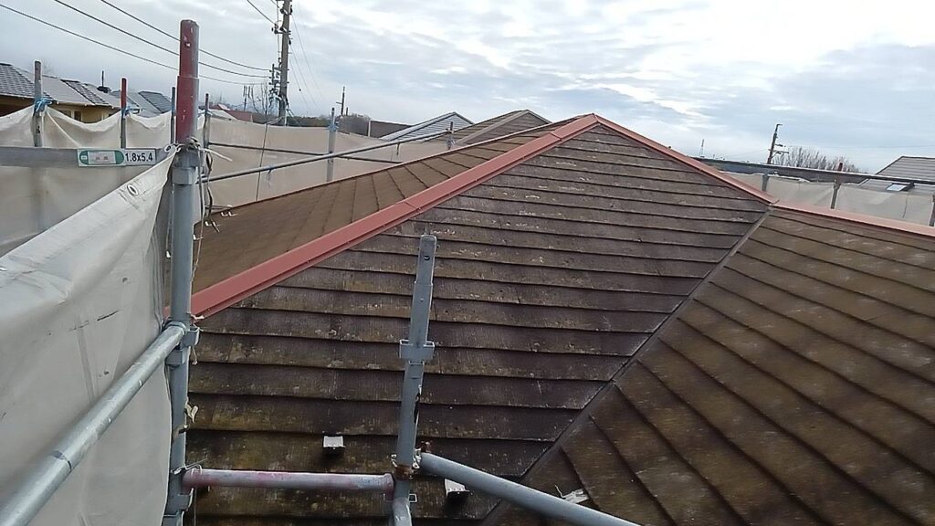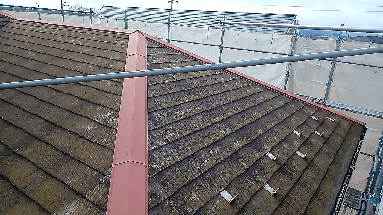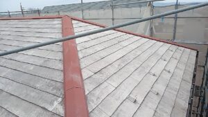 屋根のスレート材の吸い込みをキチンと抑えてから、屋根の上塗り塗料を塗っていきます。