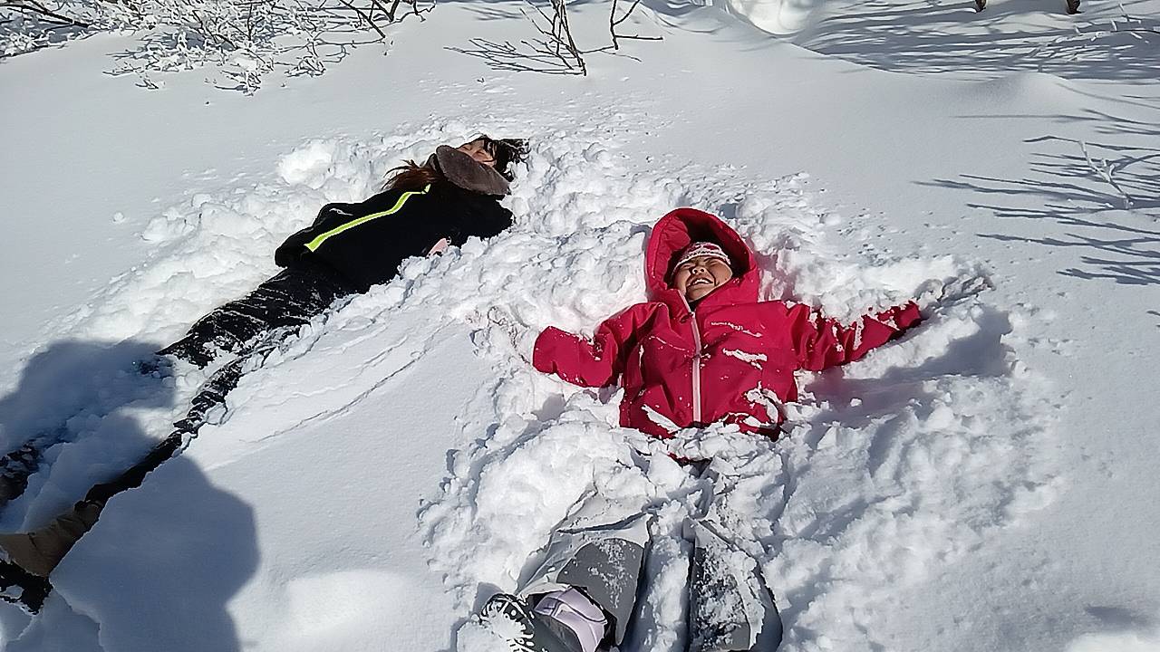 抱き起し、今度は、ママが深い雪に思い切り寝そべりました。