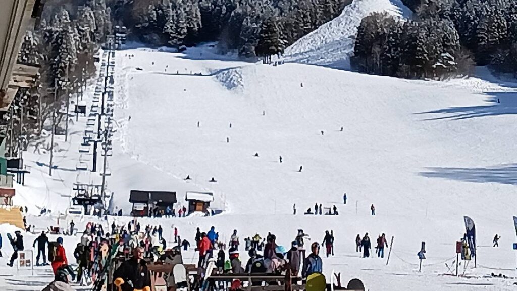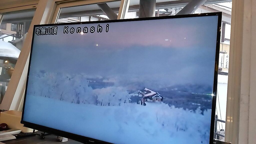 このテレビで、各ゲレンデの雪の状況を流してくれてます。